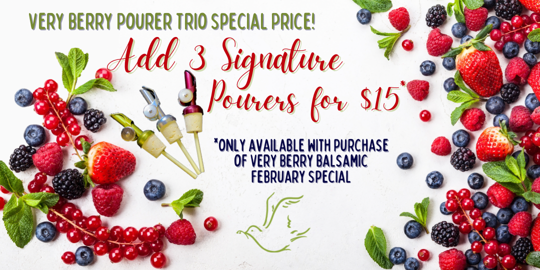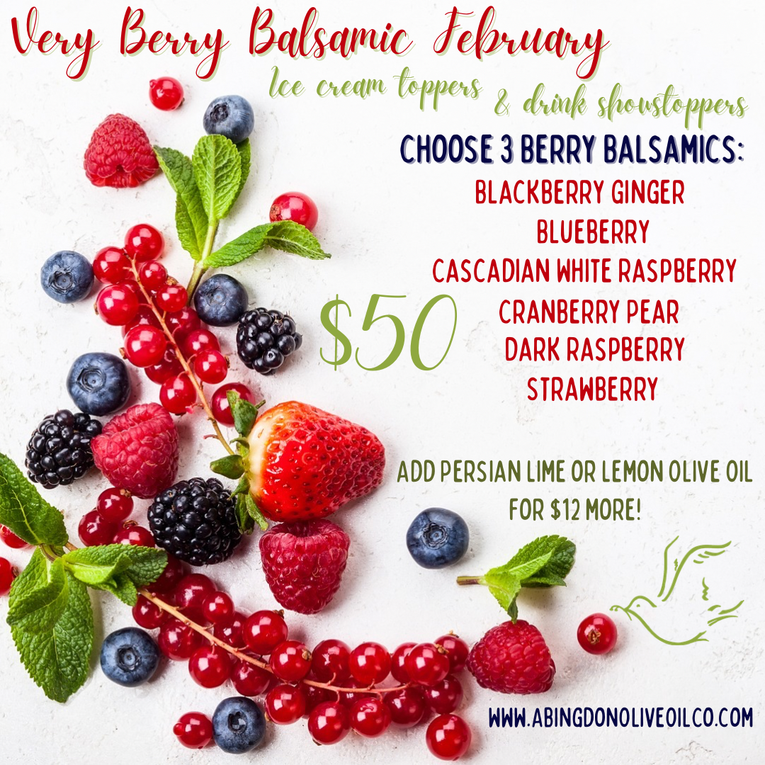 Choose 3 of your favorite "berry" Balsamics for just $50, and for $12 more add a Persian Lime Infused or Lemon Fused Olive Oil. These balsamics make the perfect toppers for your ice cream or a delicious addition to your drinks like teas, smoothies, mocktails, cocktails, or sparkling water!